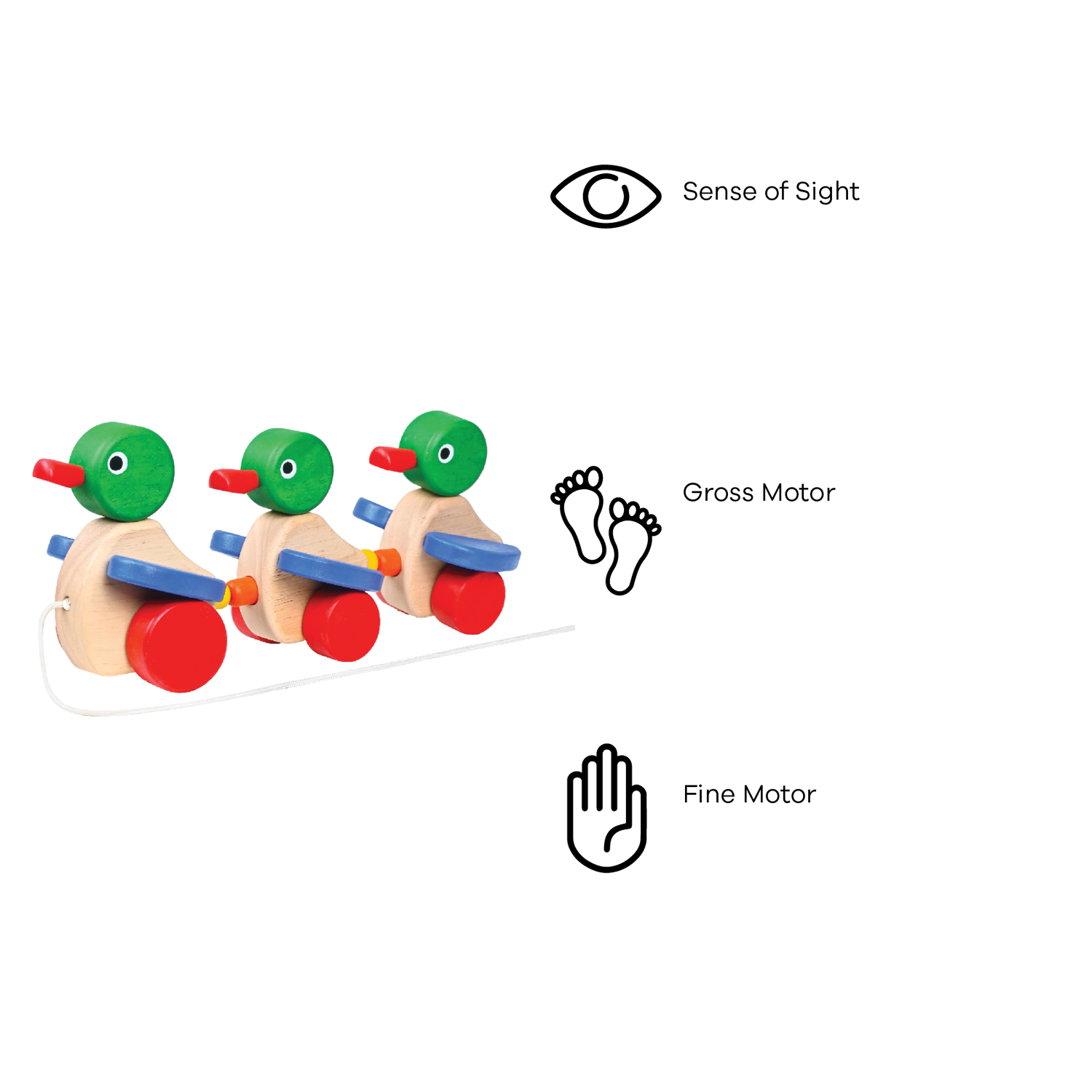 This pull toy is inspired by how a mother duck leads her ducklings. The delightful feature of this toy is that the ducks waddle and move their wings along.