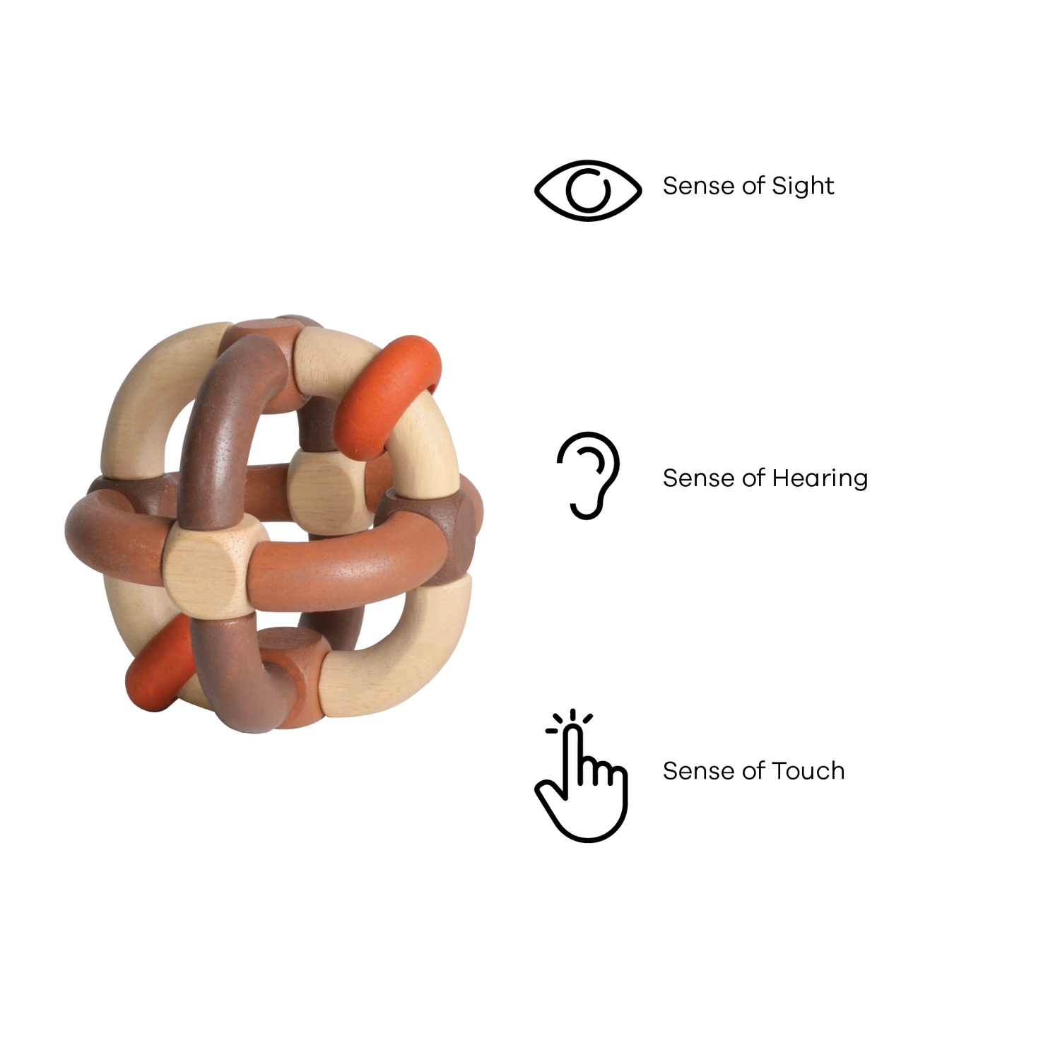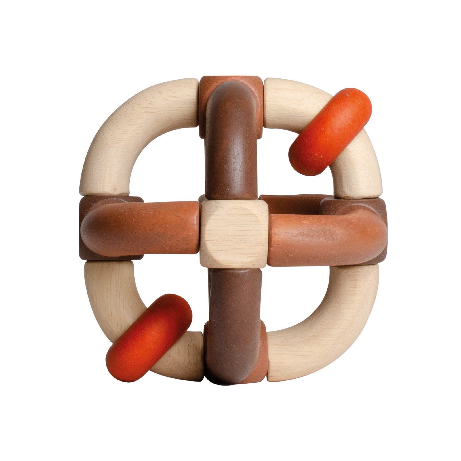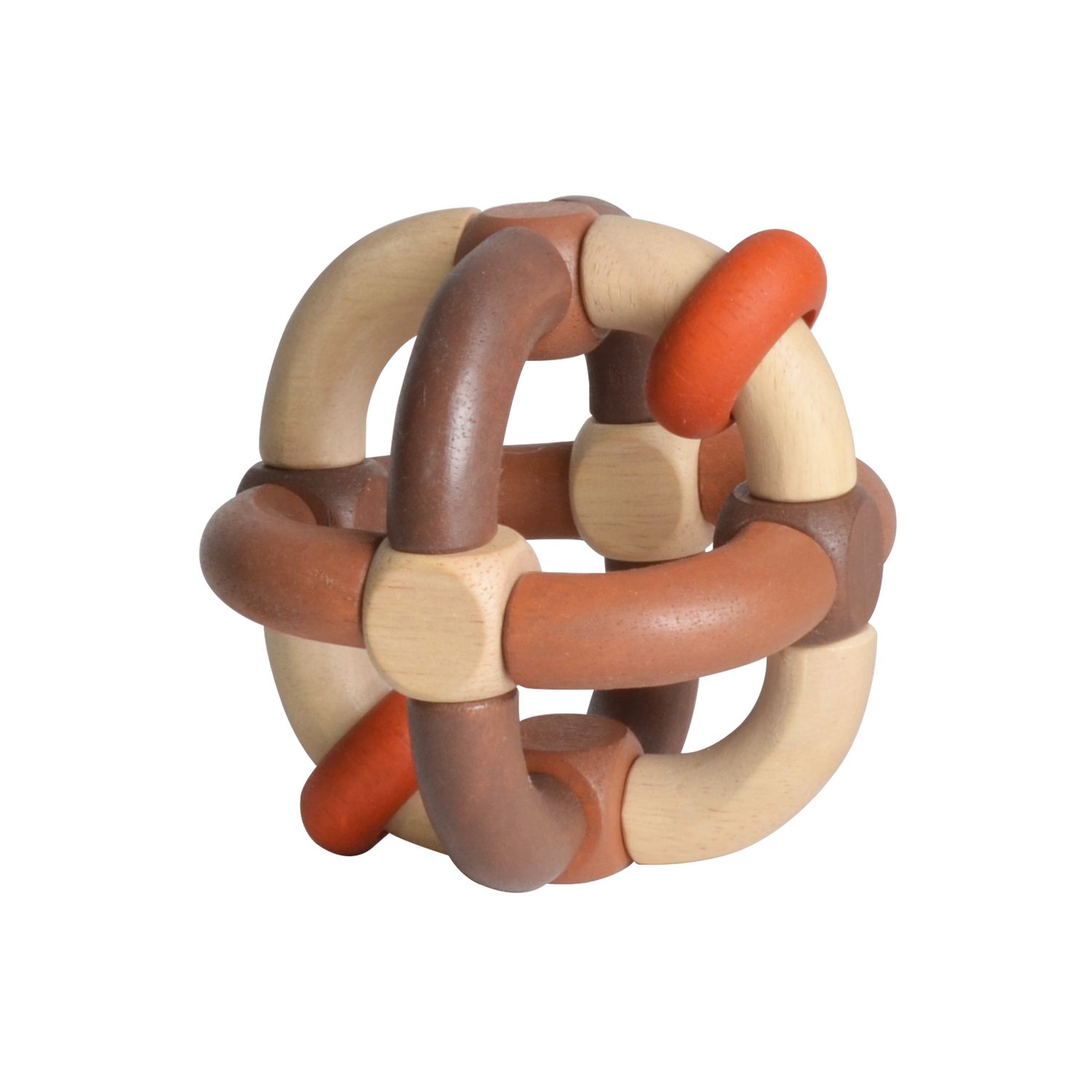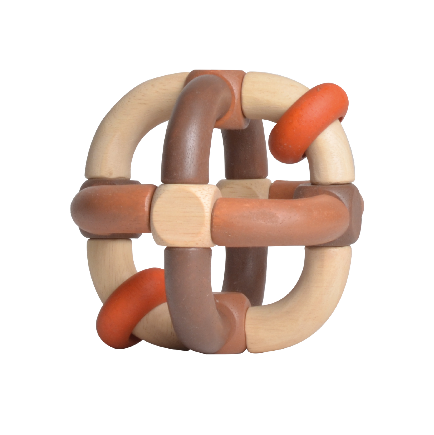 This grasping rattle is constructed of bend wooden tubes and dice bead connections. The solid wood components are connected together with elastic makes the structure more soft and flexible. This baby dice provide enough weight for developing hand grip and strength, while the bounciness of the structure makes it a gentle companion for the baby. The moving rings make sound and help provoke their senses and curiosity.