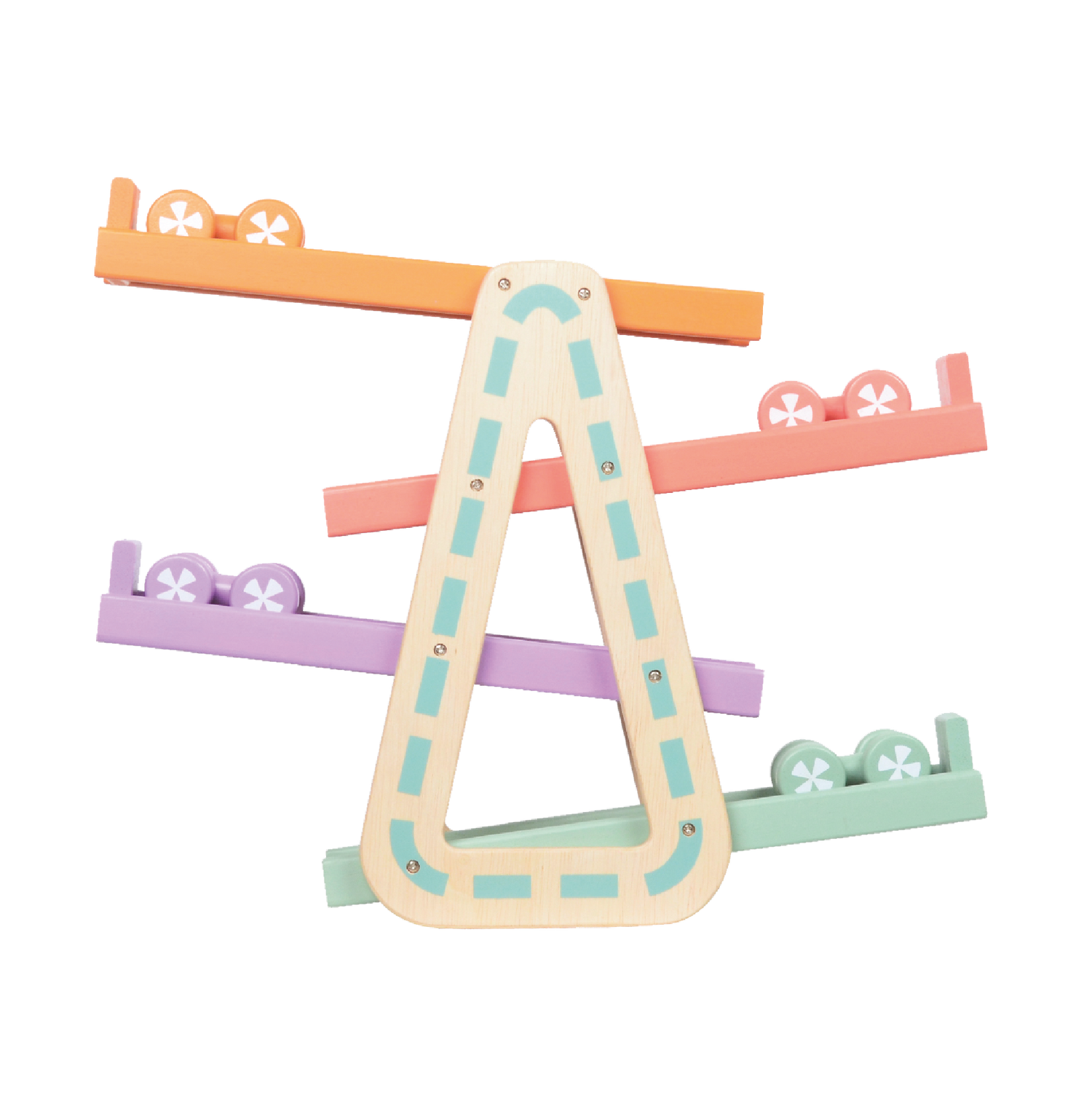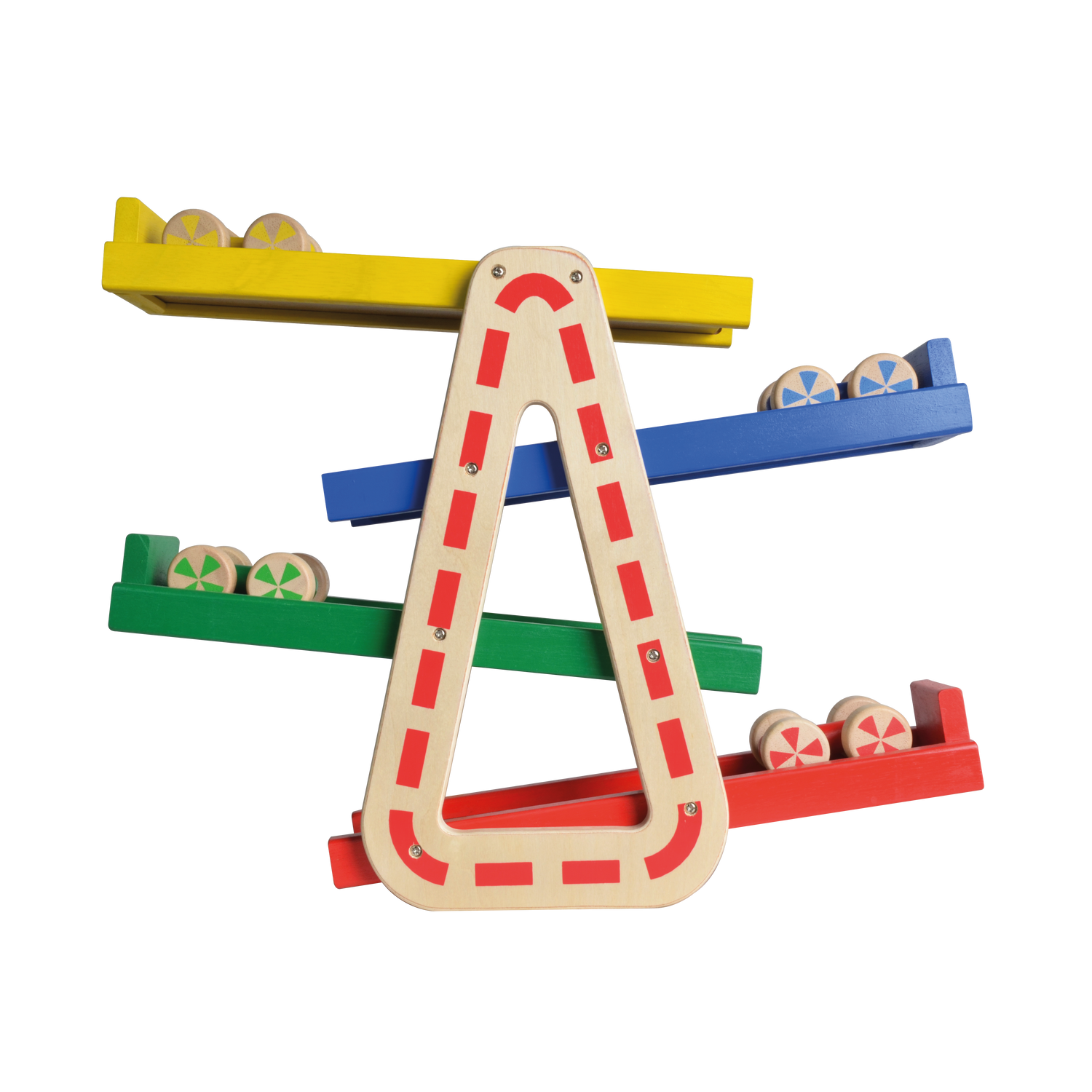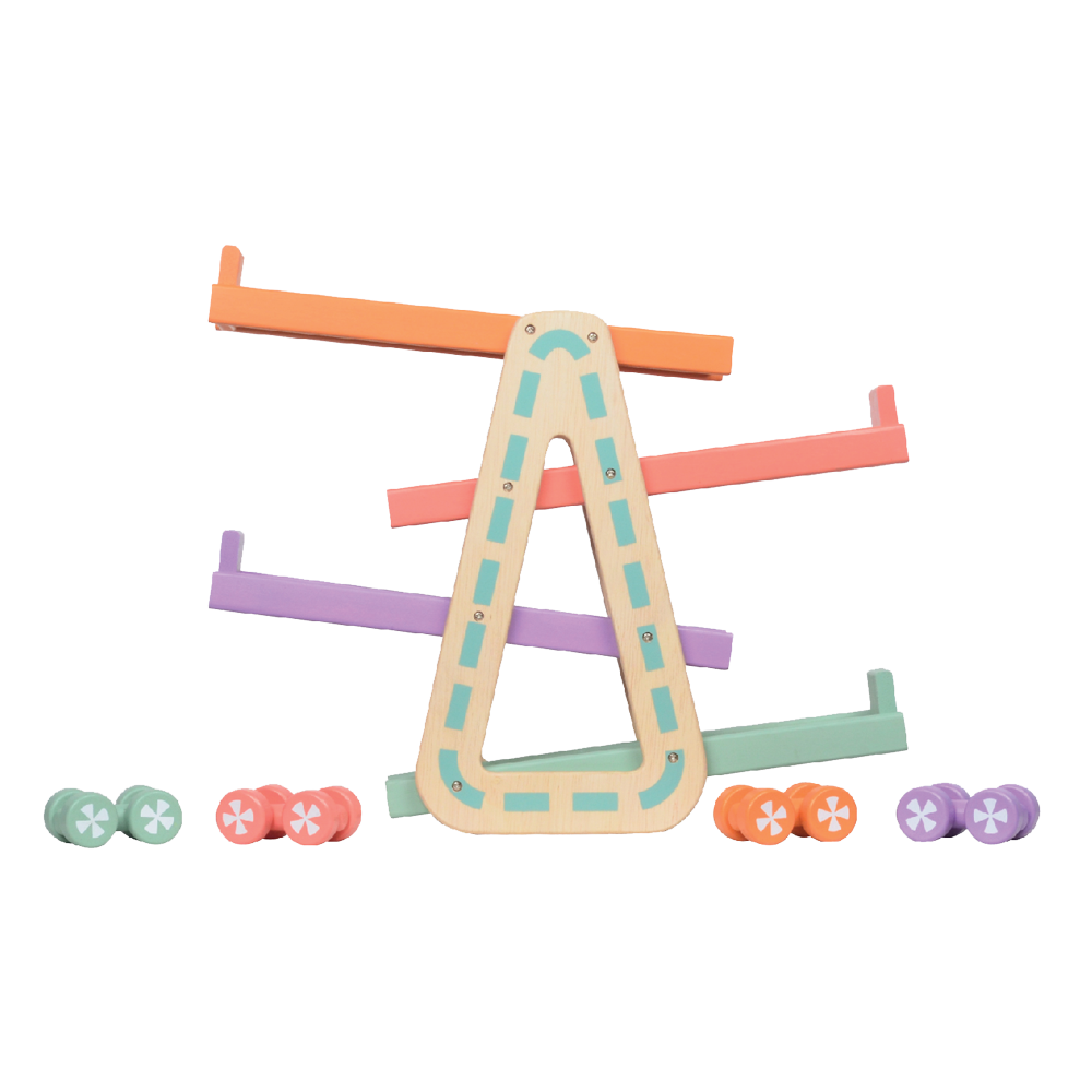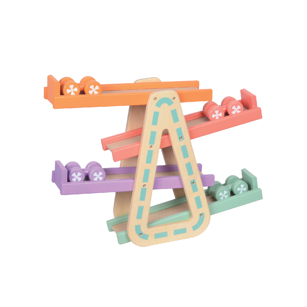 Racing toy cars down the speed ramp and refining dexterity skills at the same time. The set comes complete with four competing wooden racing cars The ramp racer requires no assembly.