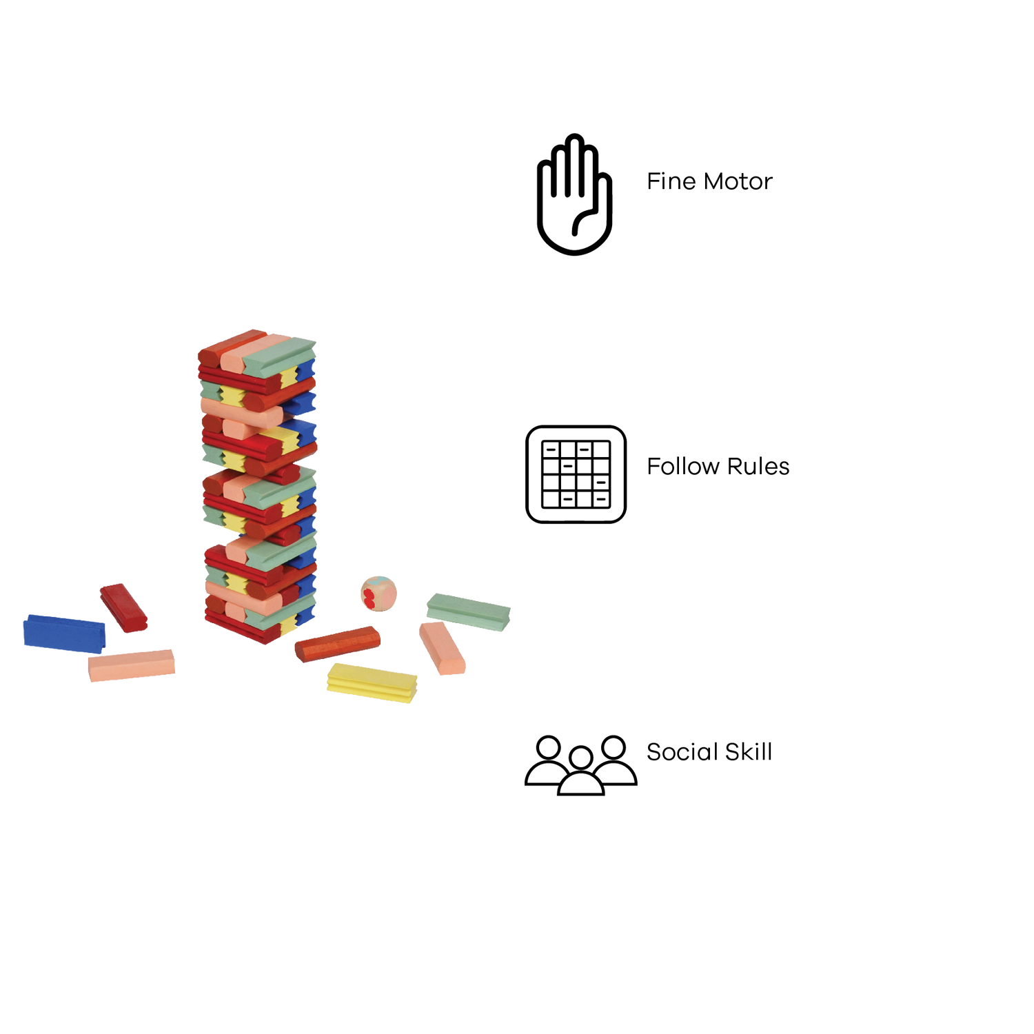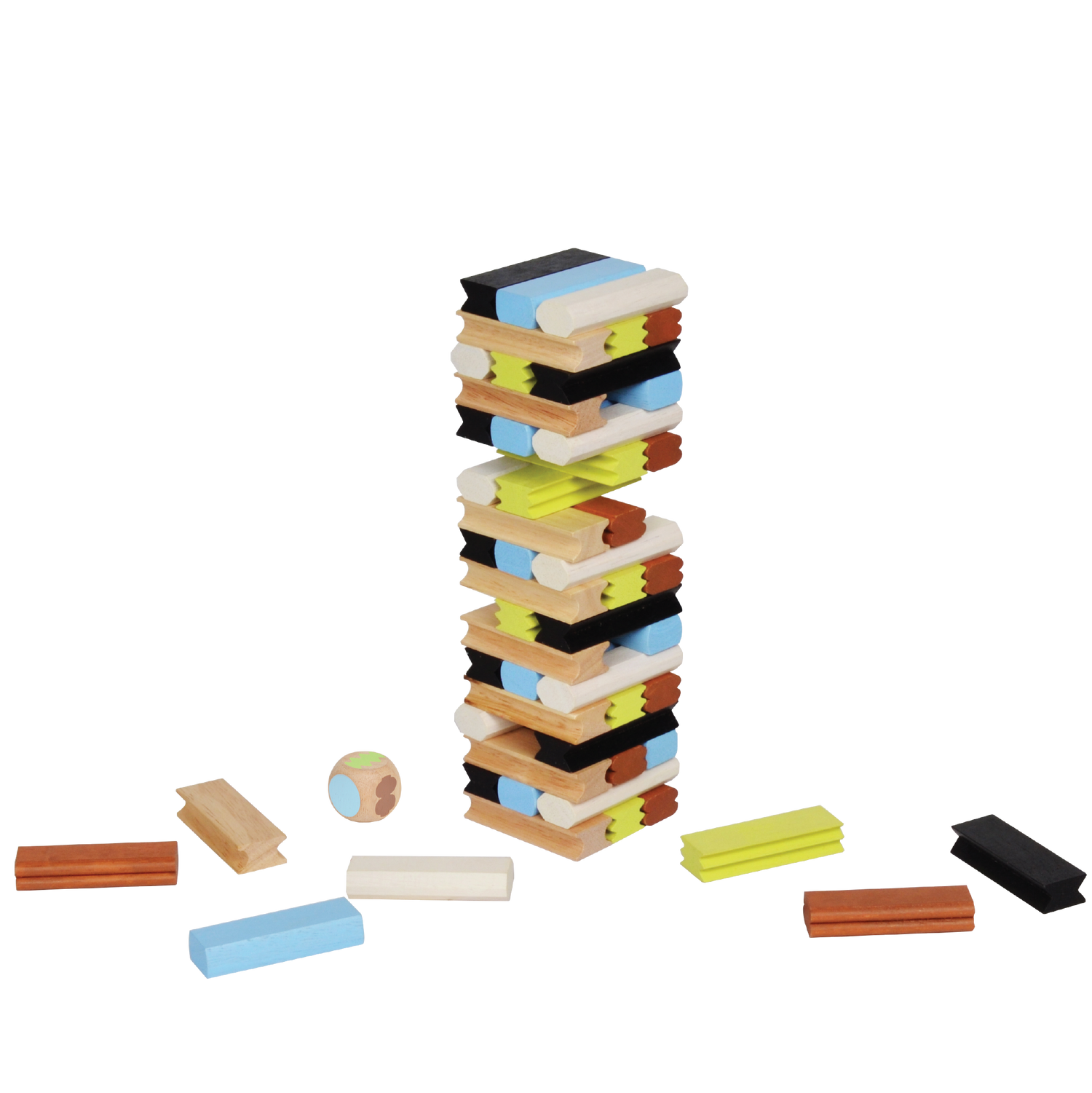 This game is a perfect family activity for everyone in every occasion. Tumbling Tower is a creative graphic twist to the traditional game with tactile grooved details. A dice is provided for more fun and challenging game. The game can also be a great table top or bookshelf decoration for the house as well.